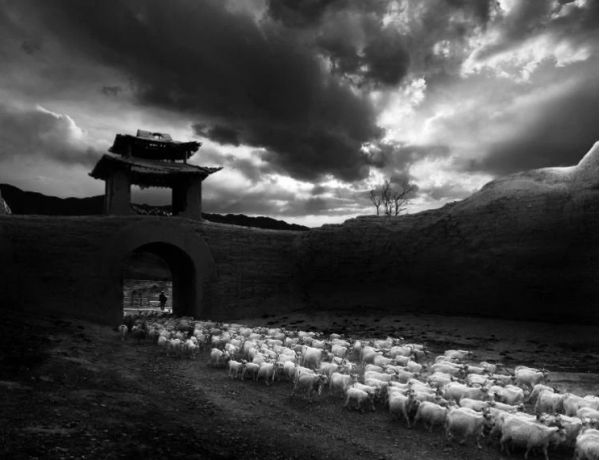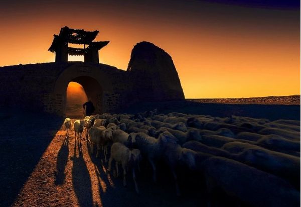5、景泰古城的落日城樓,牧羊歸來的場景,光影在城樓斜陽里,牧群歸來,塵世喧囂的生活。