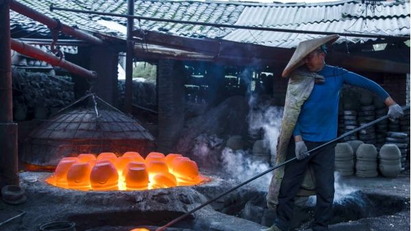 川南的市集滲透著區(qū)域百姓柴米油鹽的生活百態(tài),我們也和他們一起穿梭,感知人間百味;然后去往千年的醬園釀造作坊,時(shí)至今日,赤水河畔35度的山坡上,整整齊齊地排列著4000多口曬露缸。百余年來持續(xù)不斷的釀造傳承,日悉心照料,攪拌翻曬,形成了最獨(dú)特的風(fēng)味以及難得一見的場景。拍攝結(jié)束后前往滎經(jīng),下午在滎經(jīng)拍攝老街道、已經(jīng)手工制作陶瓷的場景。