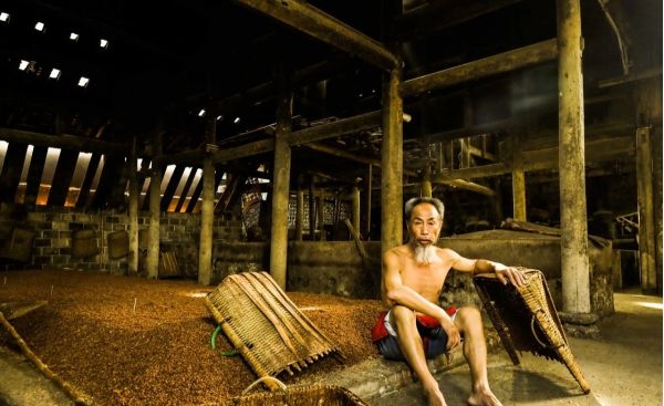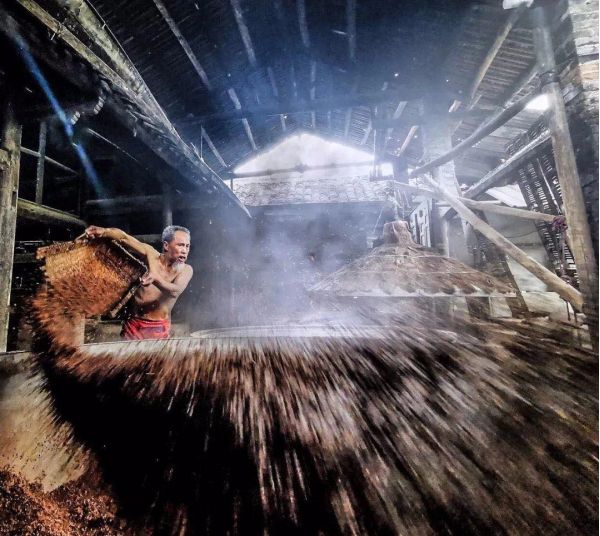 拍攝有著百年歷史的傳統(tǒng)手工藝—泡子酒,迎合著紅高粱霧蒙蒙蒸汽,仿佛置身于行宮騰云般壯觀??揪茙煾祩兌酥圃愦┧笮凶?,或激情揮灑酒曲之間,所到之處,散發(fā)著一種勞動(dòng)之美,力量之美。將近午時(shí)光束穿透老屋頂,投射到古老的作坊,這里便是暈染了熱騰騰的場景。