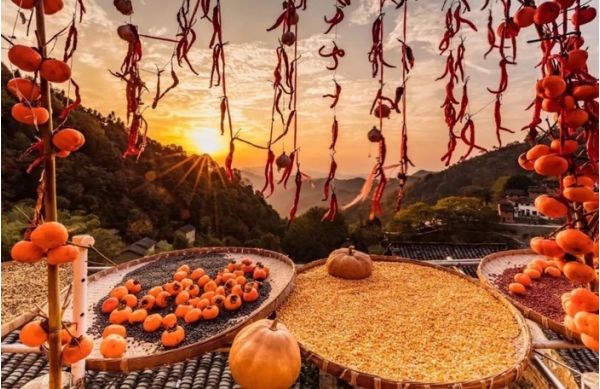 曬秋是一種典型的農(nóng)俗現(xiàn)象,具有極強(qiáng)的地域特色。在湖南、廣西、安徽、江西等生活在山區(qū)的村民,由于地勢(shì)復(fù)雜,村莊平地極少,只好利用房前屋后及自家窗臺(tái)屋頂架曬、掛曬農(nóng)作物,久而久之就演變成一種傳統(tǒng)農(nóng)俗現(xiàn)象。