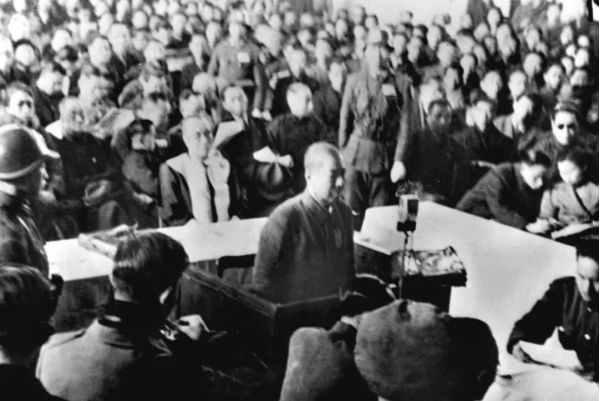 這是抗日戰(zhàn)爭勝利后,制造南京大屠殺的主要罪犯、日軍第6師團(tuán)師團(tuán)長谷壽夫被押上審判臺并被處死刑。