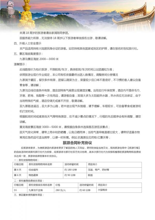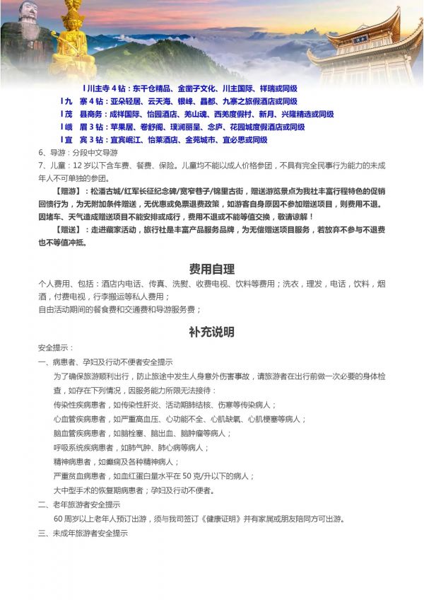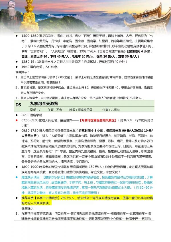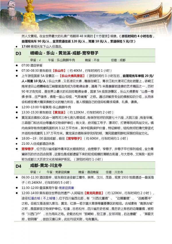 四川雙飛8日游 聊城出發(fā) 純玩 無購物 成都 黃龍溪 樂山 峨嵋山 九寨 黃龍 都江堰 熊貓樂園 ...... 發(fā)團(tuán)日期 20230612 20230619 20230703 價格 3380 3580 報名電話 0635 8681234