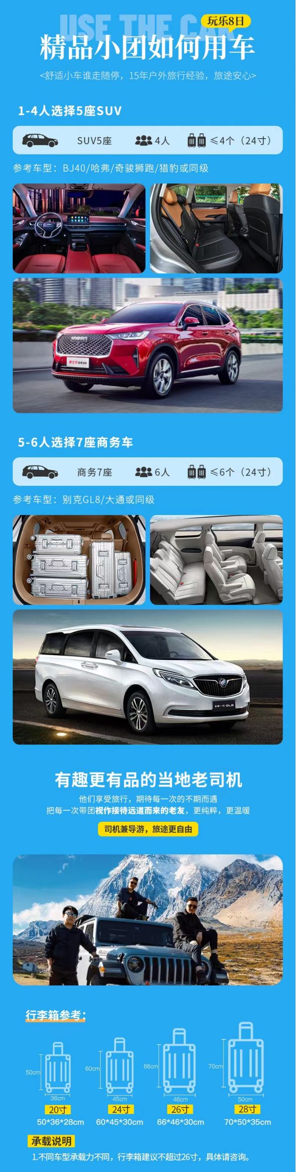 服務(wù):由經(jīng)驗(yàn)豐富的司機(jī)供向?qū)Х?wù);司機(jī)不進(jìn)入景區(qū),但提供酒店拿房、行程安排等服務(wù),望您諒解。