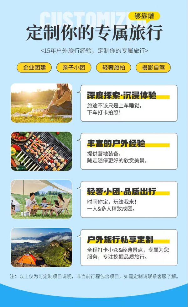 私人訂制:我們業(yè)務(wù)范圍囊括了全國(guó)各大城市,川西、西北、新疆、西藏,在路上永遠(yuǎn)有我們的身影。我們將為每一個(gè)有定制需求的你策劃出獨(dú)屬于自己的完美旅行。