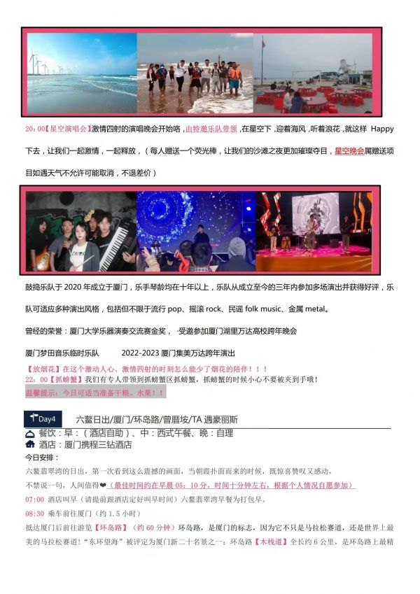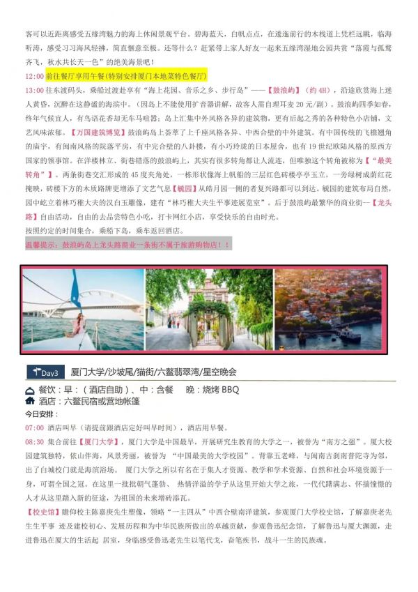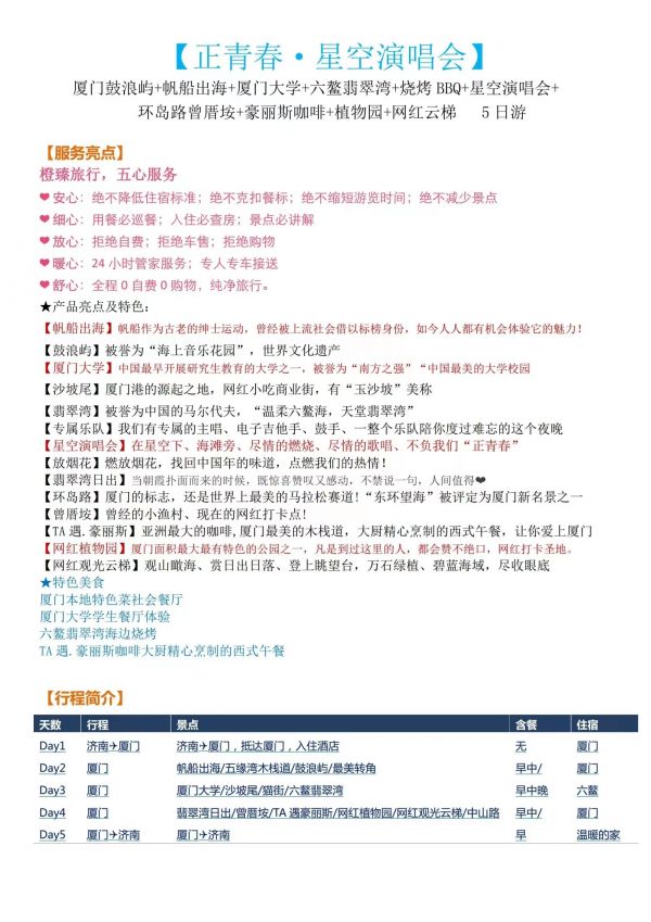 廈門-星空演出雙飛5日游 聊城發(fā)團(tuán) 純玩 無購物 廈門鼓浪嶼 帆船出海廈門大學(xué) 星空演唱會六鰲翡翠灣 環(huán)島路曾厝垵 科技館 八市網(wǎng)紅植物園 ...... 發(fā)團(tuán)時間 20230621-20230625 20230628-20230702 價格 4190 報名電話 0635 8681234