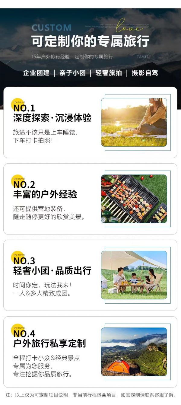 私人訂制:我們業(yè)務(wù)范圍囊括了全國(guó)各大城市,川西、西北、新疆、西藏,在路上永遠(yuǎn)有我們的身影。我們將為每一個(gè)有定制需求的你策劃出獨(dú)屬于自己的完美旅行。
