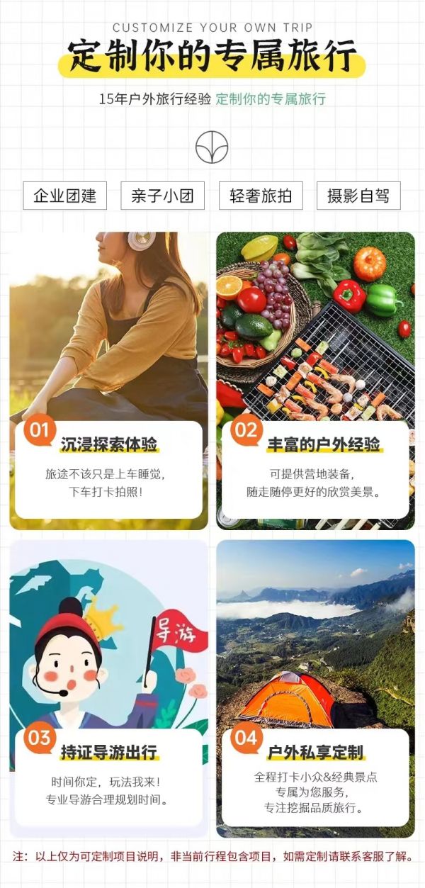 私人訂制:我們業(yè)務(wù)范圍囊括了全國各大城市,川西、西北、新疆,在路上永遠(yuǎn)有我們的身影。我們將為每一個(gè)有定制需求的你策劃出獨(dú)屬于自己的完美旅行。