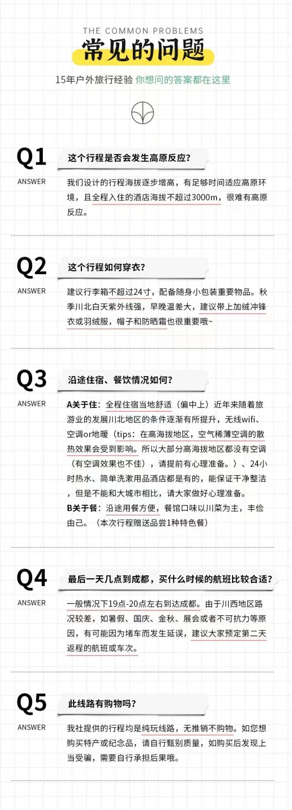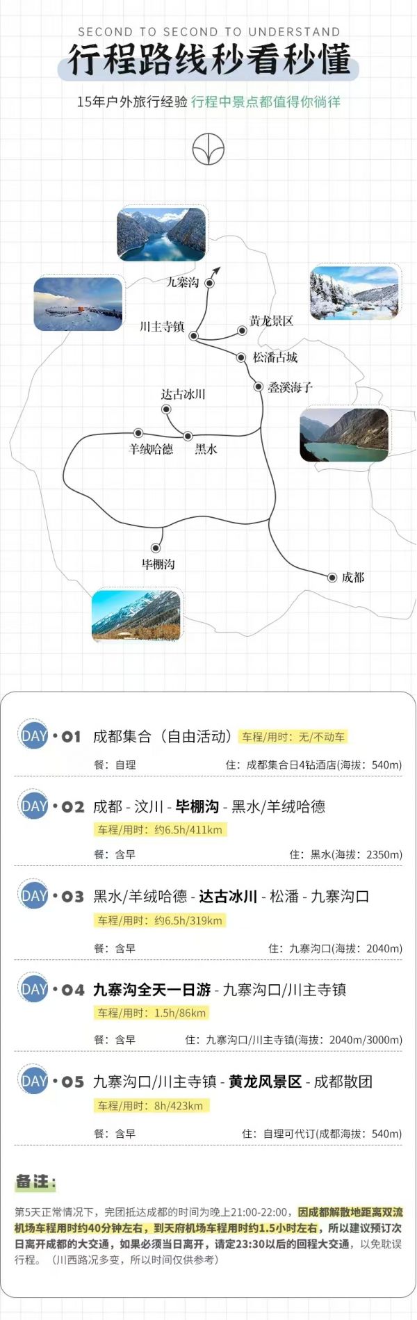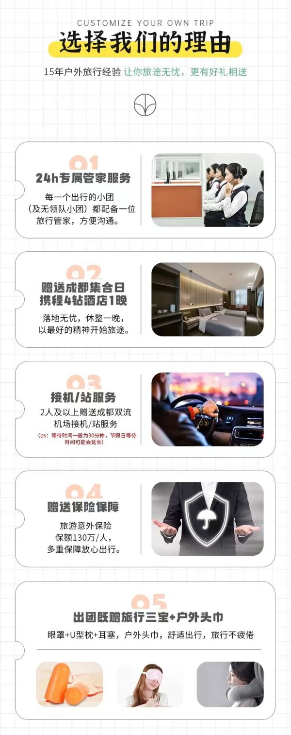 (1)受天氣、堵車等客觀因素影響,當(dāng)日回成都比較晚,請盡量不預(yù)訂當(dāng)天的返程機(jī)票或火車票,以免因?yàn)槎萝嚱o您帶來沒有必要的損失。