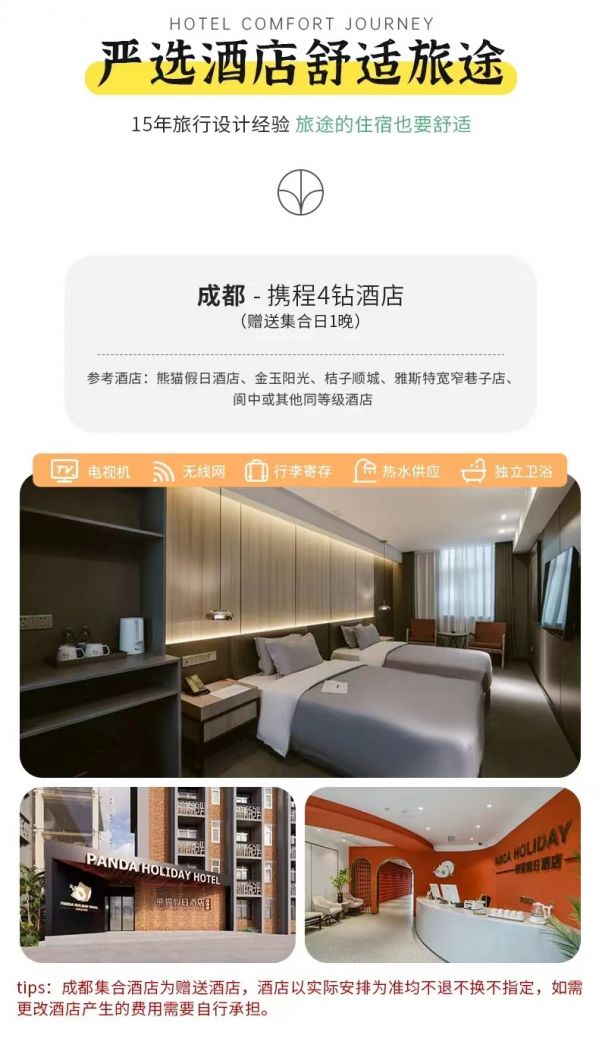 住宿:含全程4晚舒適酒店。(tips:成都集合酒店為贈送酒店,酒店以實(shí)際安排為準(zhǔn)均不換不退不指定,如要更改酒店產(chǎn)生的費(fèi)用需要自行承擔(dān)。)