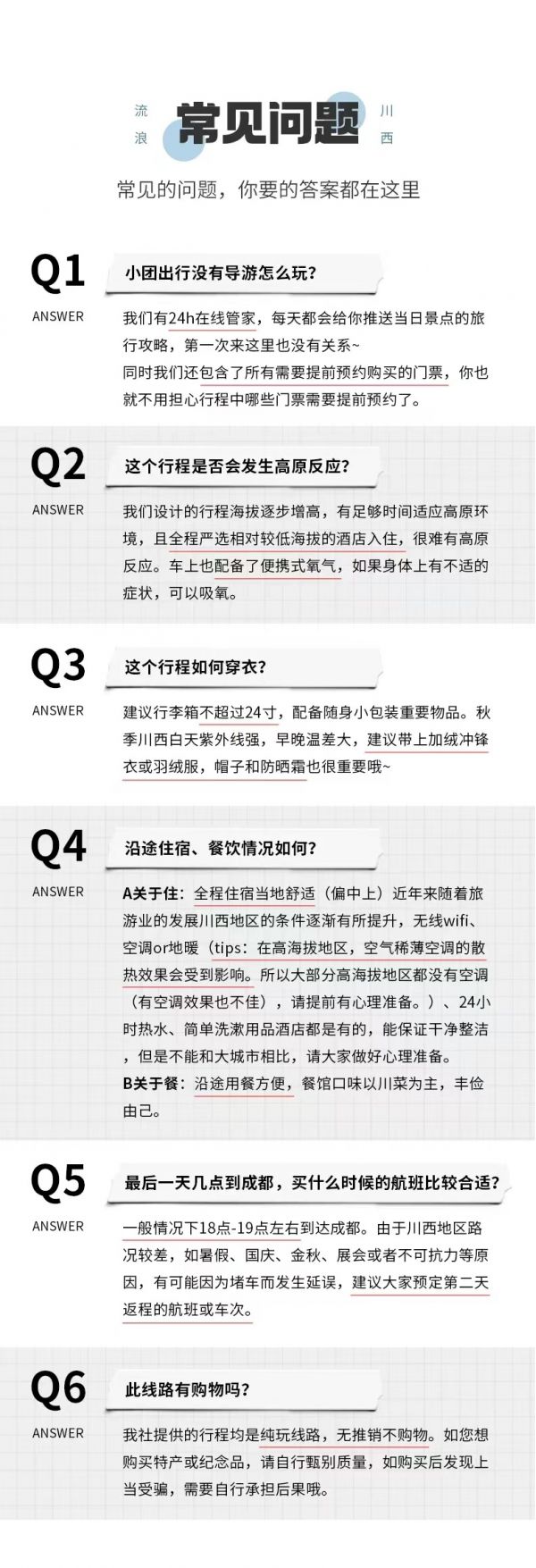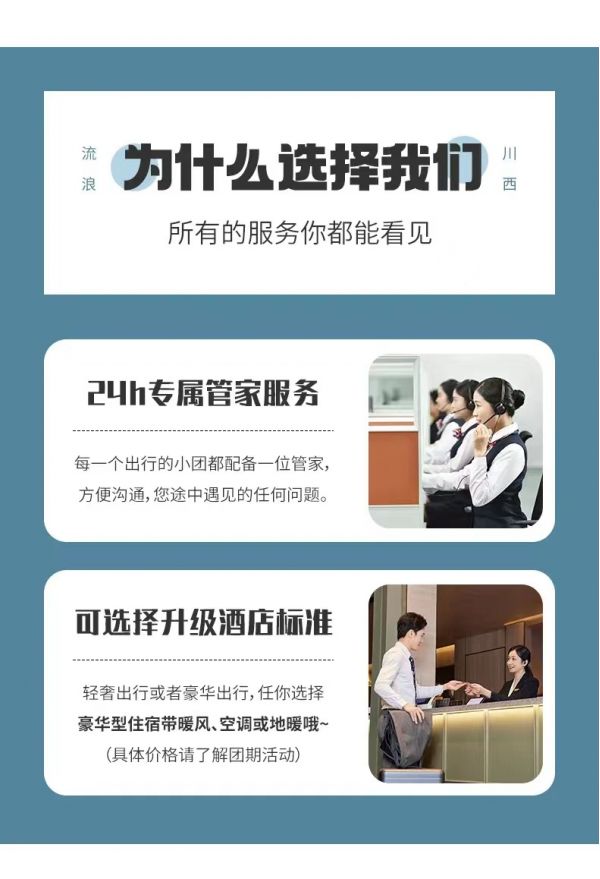 (3)因川西各景點間路途遙遠孕婦、哺乳期兒童、70歲以上老人不宜報團(65-70歲之間參團需簽訂免責協(xié)議)