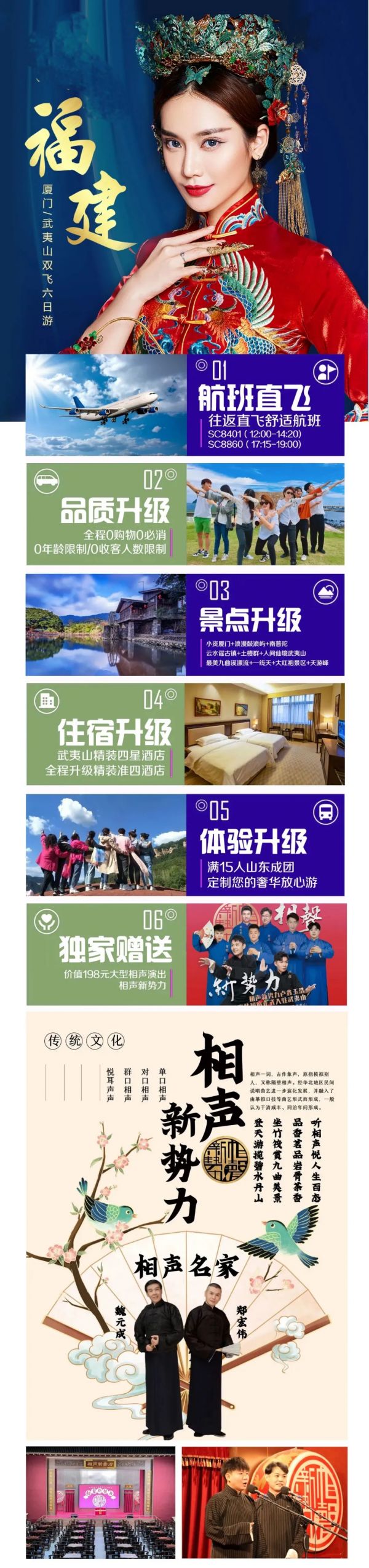 到達(dá)后導(dǎo)游接站游【大紅袍景區(qū)】四顆珍貴的大紅袍茶樹(shù)在九龍窠下,人稱(chēng)“茶中之王”。游全國(guó)最窄的【一線(xiàn)天】,伏羲洞、靈巖洞、風(fēng)洞三洞相映成趣、神仙樓閣等奇妙景 白天登天游,晚上聽(tīng)相聲,----獨(dú)家贈(zèng)送價(jià)值198元【大型相聲演出】---相聲新勢(shì)力,來(lái)聽(tīng)聽(tīng)武夷山茶文化和相聲文化的完美結(jié)合吧,嗑瓜子,品香茗,聽(tīng)相聲,絕這才是旅行的正確打開(kāi)方式!