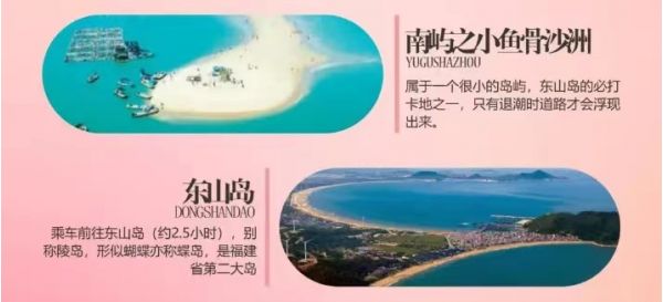 東山島:別稱陵島,形似蝴蝶亦稱蝶島,是福建省第二大島,曾獲得福建省最佳旅 游目的地、福建省“十大旅游品牌”、‘福建十大美麗海島’‘等榮譽。在東山島還拍攝過《八仙過海》《西游記》 《左耳》《我是誰的寶貝》《我們來了第二季東山站)》等影視娛樂作品!