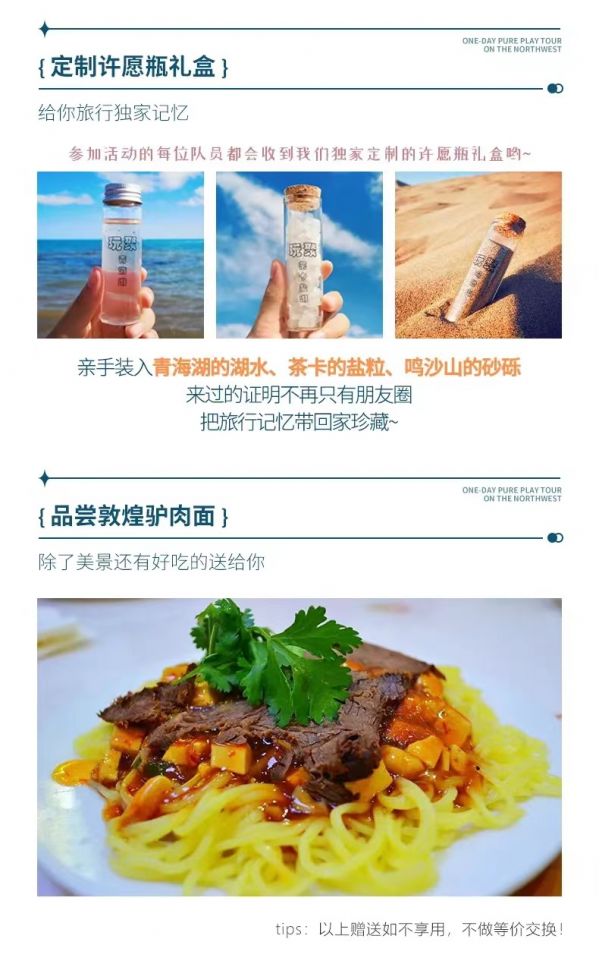tips:西寧集合酒店為贈送酒店,酒店以實(shí)際安排為準(zhǔn)均不退不換不指定,如要更改酒店產(chǎn)生的費(fèi)用需要自行承擔(dān)。(4)品嘗敦煌驢肉面。