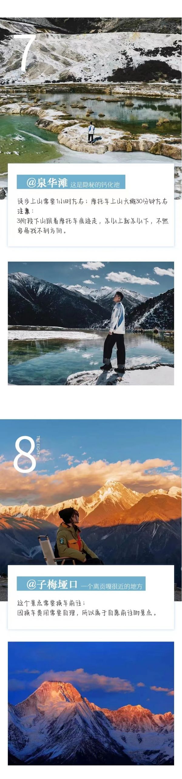 早餐后出發(fā),前往冷嘎措, 徒步時間步 2-3 小時(可選擇騎馬單面 200,或者摩托車往返200,費(fèi)用自理),到達(dá)冷嘎措自由拍攝大片( 海拔4500 左右,切記帶上厚外套, 以及帽子圍巾墨鏡,冷噶措風(fēng)大溫度低,以防感冒高反), 觀貢嘎雪山、藍(lán)冰(藍(lán)冰根據(jù)溫度決定)然后下撤返回(冬季若遇大雪下撤時間根據(jù)實(shí)際情況安排),返回途中可以繼續(xù)前往泉華灘進(jìn)行游玩。晚上入住上木居。