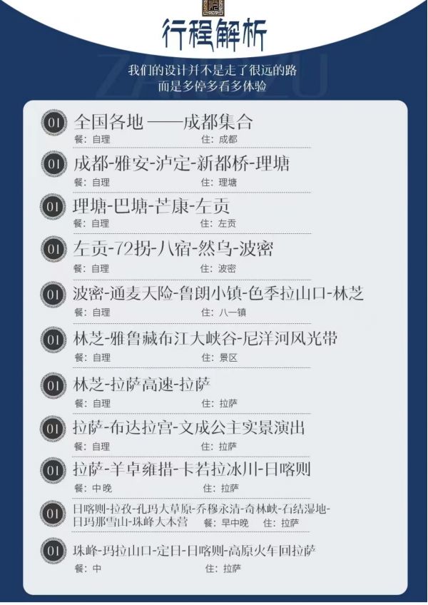 成都—雅安瀘定—新都橋--理塘-巴塘—芒康—左貢--72拐--八宿—然烏—波密--通麥天險--魯朗小鎮(zhèn)--色季拉山口--喬穆永青--奇林峽--定結(jié)濕地--日瑪那雪山--珠峰大本營--林芝-雅魯藏布大峽谷--尼洋河風(fēng)光帶--林拉高速--拉薩-布達拉--宮羊卓雍措--卡若拉冰川--日喀則--拉孜--孔瑪大草原