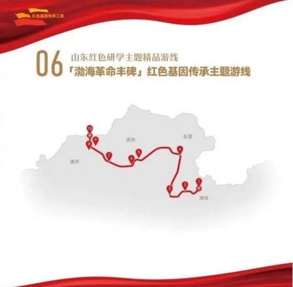 1. 濰坊市大家洼紅色革命研學(xué)基地——2.濰坊市壽光牛頭鎮(zhèn)抗日武裝起義陳列館——3.東營市紅色劉集旅游景區(qū)——4.東營市渤海墾區(qū)革命紀念館——5.濱州市渤海革命老區(qū)紀念園——6.濱州市渤海革命老區(qū)機關(guān)舊址——7.濱州市渤海革命老區(qū)兵器博物館——8.德州市冀魯邊區(qū)革命紀念園——9.德州市八路軍冀魯邊區(qū)抗戰(zhàn)郵局舊址——10.德州市北海銀行冀魯邊區(qū)分行舊址