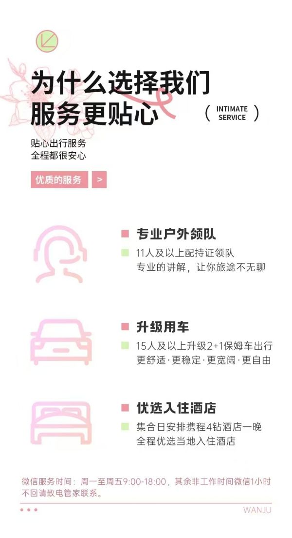 用車:15人及以上立即升級保姆車出行;為保證成團及質量,根據(jù)人數(shù)派不同座位數(shù)用車,保證每人一正座;包含司機一名、油費、:過路費、停車費,包含從出發(fā)地到景點及酒店費用,不包含晚間自由活動交通;