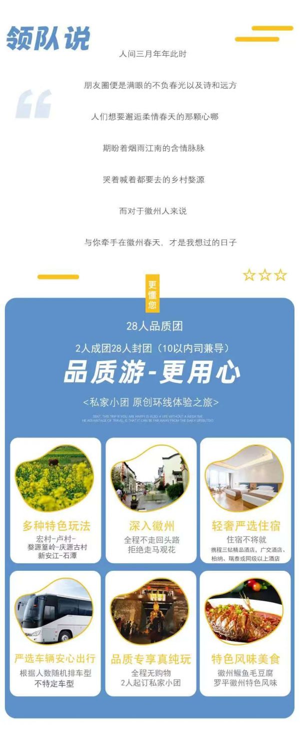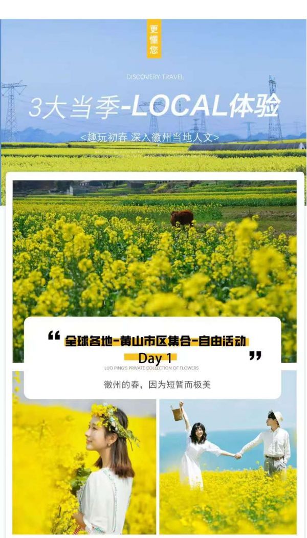 下午徒步蜀源靈山,在養(yǎng)分充足的春天里,漫步花海叢中,感受古老歷史下的小城。約3:00左右結(jié)束行程,返程 預(yù)計下午16:00抵達黃山市區(qū),建議購買16:30以后或次日返程票。