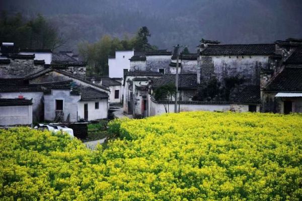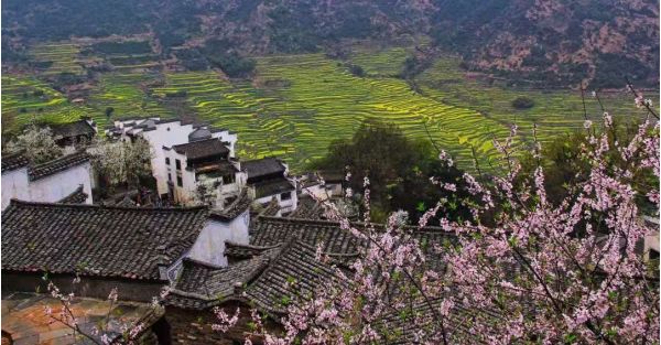 金黃色的花兒從層層梯田沿著山谷流成了海洋。粉墻黛瓦的村落里桃花紅、梨花白,還有那滿山的樹木和曲折幽靜的小路。