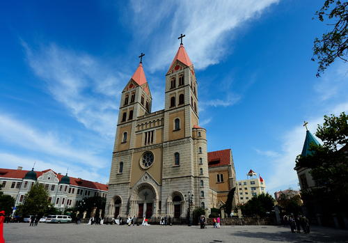 早7:00集合出發(fā),預(yù)計(jì)12:00到達(dá)青島天主教堂。后自由游覽,預(yù)計(jì)時(shí)間1小時(shí)。教堂以黃色花青島天主教堂崗巖和鋼筋混凝土砌成,表面雕以簡潔優(yōu)美的紋案。窗戶為半圓拱形,線條流暢,顯得莊重而樸素。大門上方設(shè)一巨大玫瑰窗,兩側(cè)各聳立一座鐘塔,塔身高56米,紅瓦覆蓋的錐形塔尖上各豎立一個(gè)4.5米高的巨大十字架,塔內(nèi)懸有四口大鐘,一旦鐘樂鳴奏,聲傳數(shù)里之外。