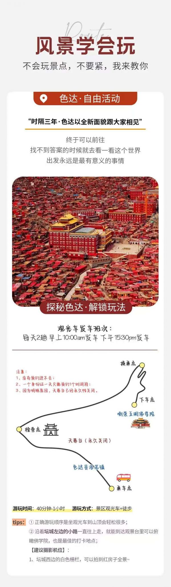 1、觀覽人員請務(wù)必注意各自所購買票務(wù)乘車點位。因色達(dá)當(dāng)?shù)厍闆r特殊景點必須乘坐景區(qū)交通,還望游客諒解!