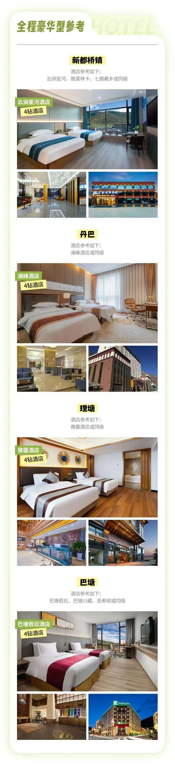 行程所列住宿地5晚住宿(輕奢型和豪華型酒店任選其一,具體價(jià)格詳情查看團(tuán)期價(jià)格或咨詢(xún)客服了解詳情),每人1床位(含成都集合日4鉆酒店1晚、不住不退不換不指定)具體了解團(tuán)期價(jià)格。
