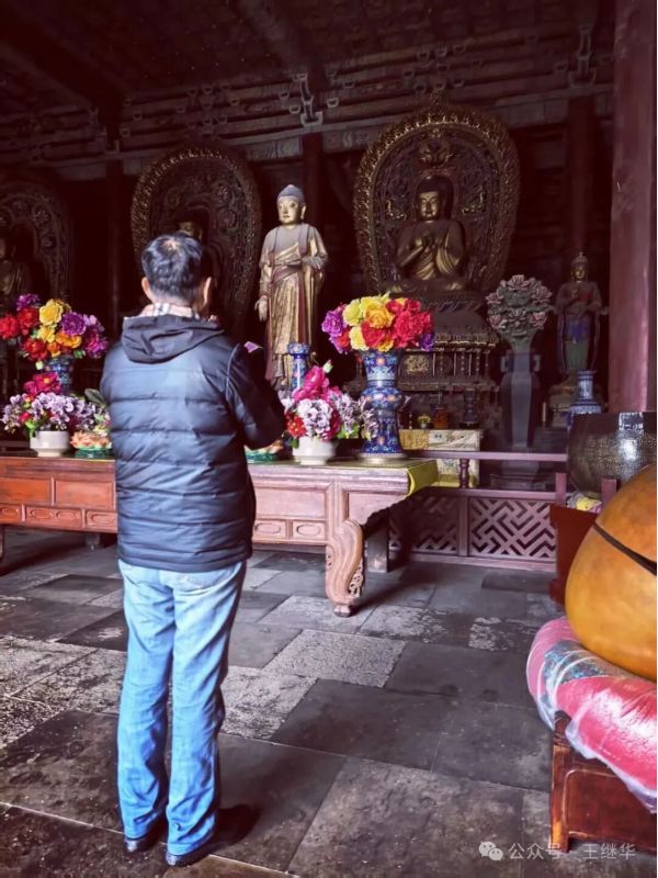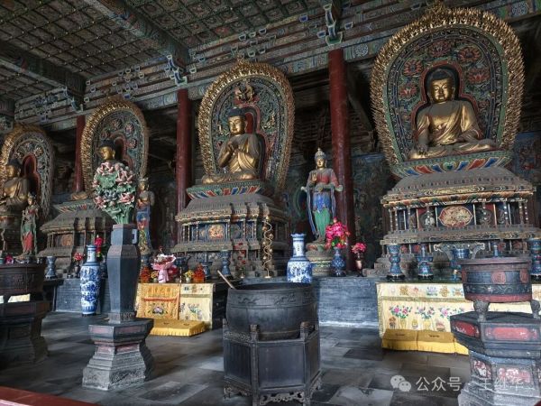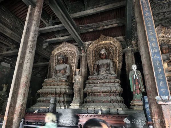 拾級而入,香火氣息混著雨絲漫進(jìn)殿內(nèi),遼代彩塑華嚴(yán)三圣在微光中靜靜佇立,衣袂褶皺仿佛還沾著當(dāng)年的匠氣。