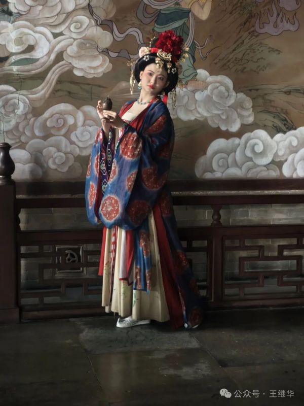 正欲細(xì)賞壁上壁畫,卻見殿外廊下閃過一抹亮色——幾位女子身著唐裝,對襟襦裙被雨水打濕了邊角,發(fā)間銀簪卻依舊耀眼。她們?nèi)徊活櫤?,或倚著紅柱整理裙擺,或舉著相機(jī)對著經(jīng)幢取景,笑鬧聲穿過雨幕,為肅穆的古寺添了幾分鮮活。