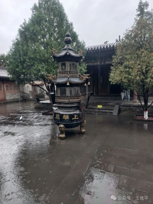 離開前在普賢閣旁,導(dǎo)游指著樓閣飛檐:“金代修這座閣時,特意讓檐角向外翹得更陡,就是為了讓雨水更快落下,保護(hù)木構(gòu)。”雨還沒停,褲腳已濕得透涼,手腳凍得發(fā)麻,可想起她講的古建智慧,倒覺得這場低溫冷雨,讓善化寺的千年故事聽得更清楚——原來時光從不是悄無聲息的,它藏在雨滴敲打的節(jié)奏里,藏在木構(gòu)呼吸的紋理中。