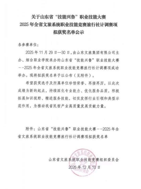 12月11日,山東省“技能興魯”職業(yè)技能大賽旅行社計調(diào)賽項獲獎名單正式發(fā)布。由聊城市精品旅游促進會旅行社專委會會長劉寶平帶領的聊職院師生團隊,憑借扎實的專業(yè)功底與出色的實操能力在賽事中脫穎而出,一舉斬獲多項榮譽。