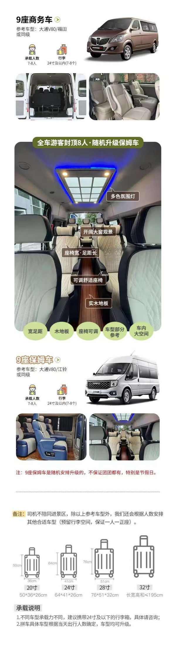 為保證成團及質量,根據(jù)人數(shù)派不同座位數(shù)用車,保證每人一正座;