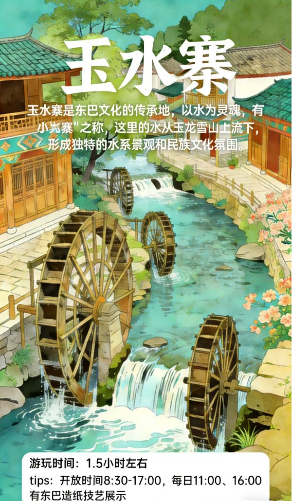 我參觀了玉水寨和東巴谷。玉水寨是納西族東巴文化的重要傳承地,這里有許多東巴文化的遺跡。