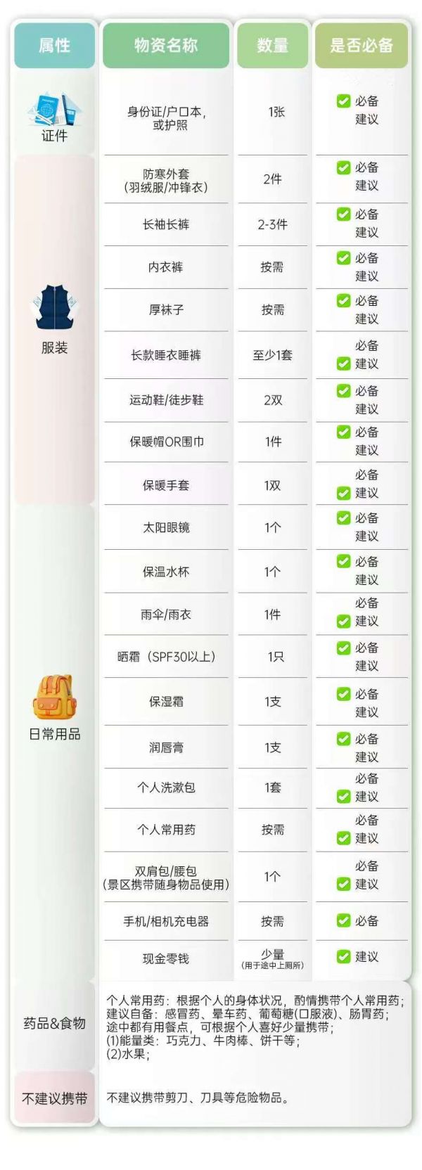 氣候多變,晝夜溫差大,紫外線強,請大家務必注意防寒與防曬,春夏季節(jié)出行,參考以下物品準備行李: