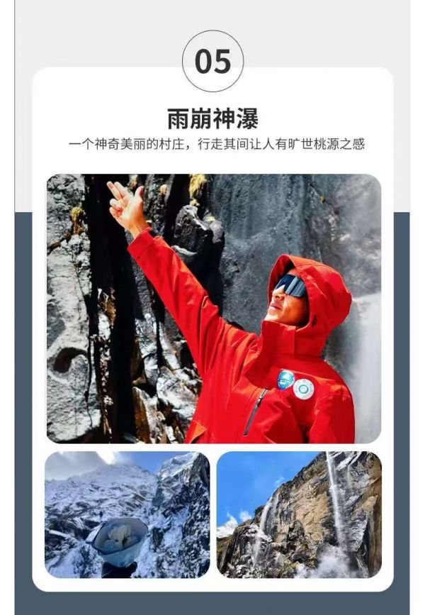 今天全程大約14公里。用時6-8小時。沿著尼農(nóng)大峽谷一路徒步,兩邊是懸崖峭壁,這是古人從懸崖上鑿出來的一條通往雨萌秘境的陽光大道。徒步大約3.5小時到達補給點在這里稍作休息,后沿著公路前往雨崩,沿途美景如畫,令人目不暇接。到達雨崩村客棧后辦理入住自由活動。
