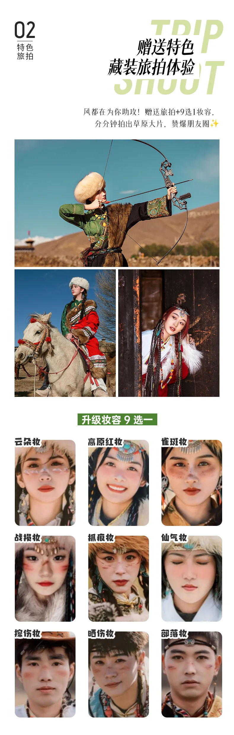 1、包含體驗(yàn)特色藏裝旅拍(3張精修照片含5張高清底片),面部裝飾9選1,不含底妝;