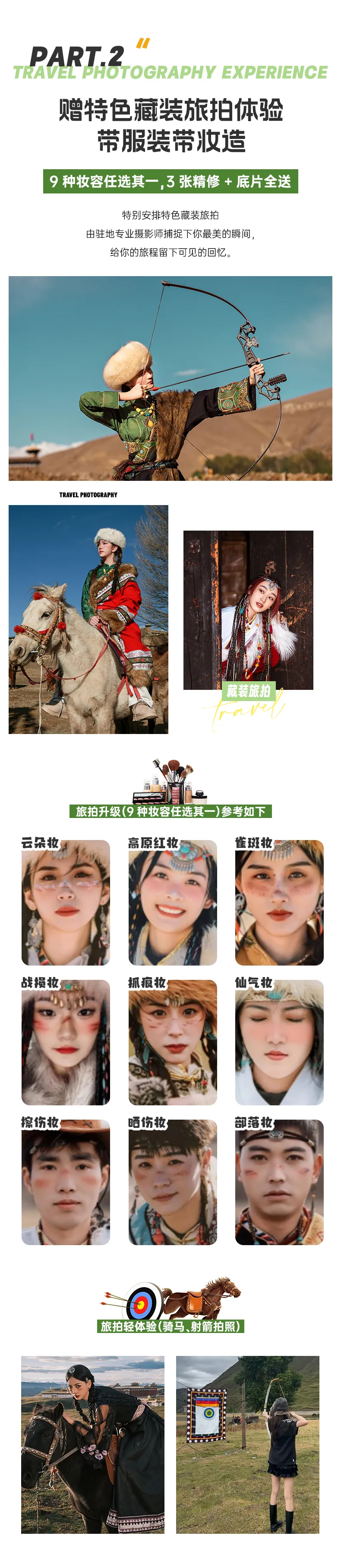 1、包含體驗特色藏裝旅拍+體驗騎馬射箭(3張精修照片含5張高清底片),面部裝飾9選1,不含底妝;