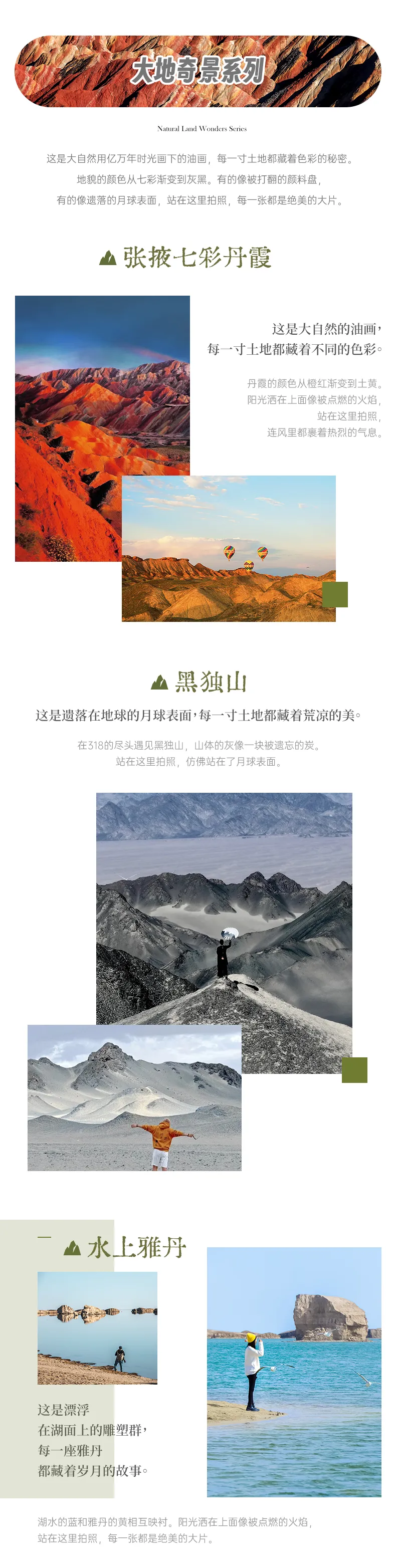 包含茶卡鹽湖門票、鳴沙山月牙泉門票、張掖七彩丹霞門票、察爾汗鹽湖門票、水上雅丹門票