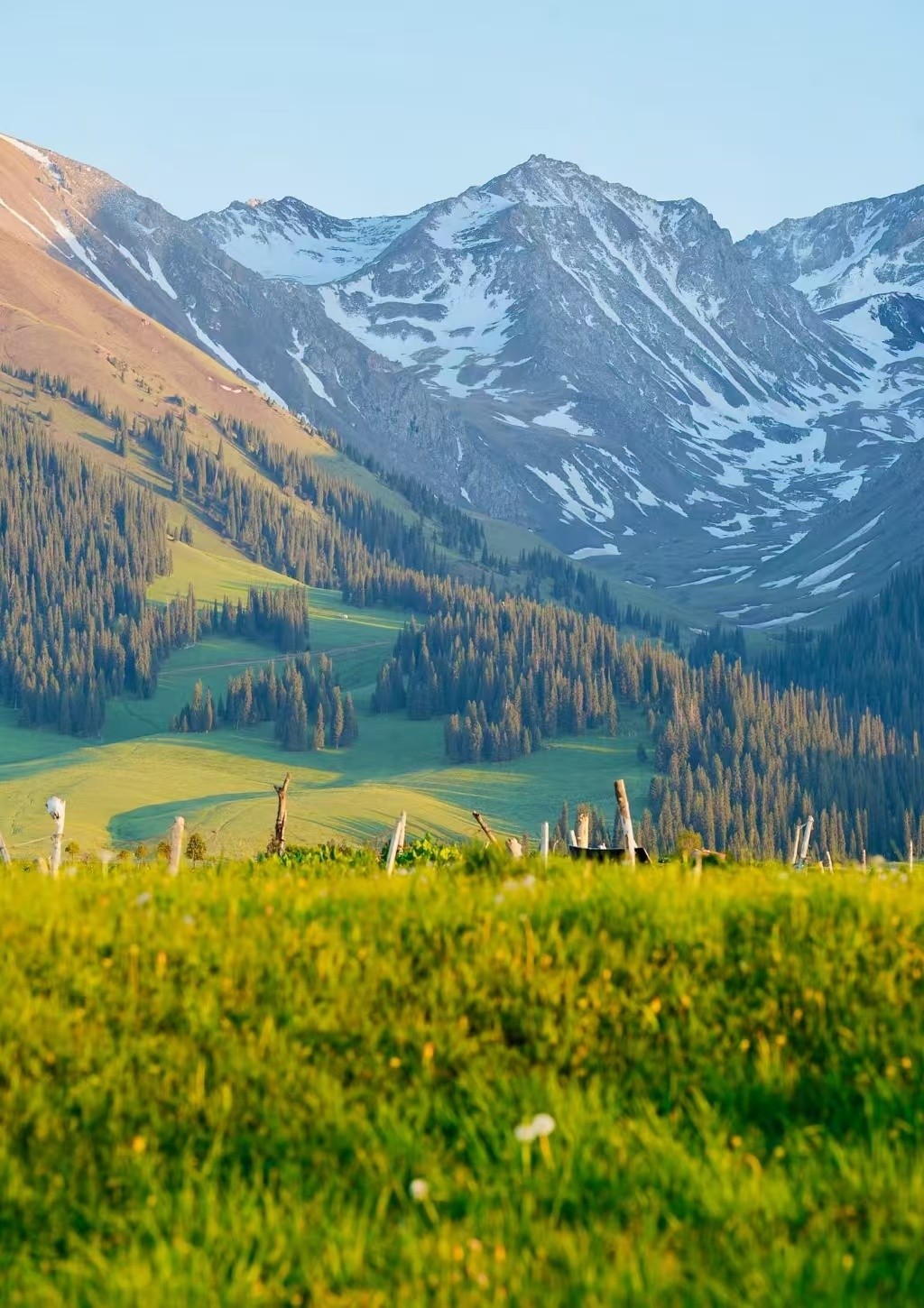 早餐后,告別連綿的草原林海,駛?cè)?strong>獨庫公路北段(僅限7座及以下車輛通行),車輪碾過的每一寸路,都是天山精心鋪就的風(fēng)光畫卷。沿途溪水湍急繞山而行,哈薩克族白氈房散落在路旁,牛羊悠然啃食青草,游牧風(fēng)情撲面而來。行至唐布拉百里畫廊,一眼望不盡的草原如綠毯鋪展,金黃野花肆意盛放,云杉林簇?fù)碇焖{色遠山,喀什河谷碧水蜿蜒,雪山倒影映于水中,隨手一拍皆是媲美瑞士的風(fēng)光大片。