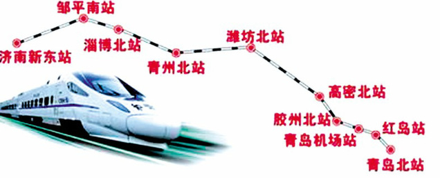 隨著環(huán)境影響報告書的完成,濟南東站、鄒平南站、淄博北站、青州北站、濰坊北站、高密北站、膠州北站、青島機場站和紅島站等9大車站也得以最終確定。9座車站中,濟南東站和紅島站為始發(fā)站,其余7站為中間站。其中濟南東客站設動車運用所;紅島站則設動車停車場。