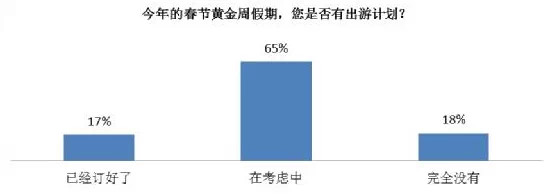 距2015年春節(jié)黃金周假期只有1個(gè)多月了,調(diào)查顯示,有出行意愿的網(wǎng)民達(dá)到八成。17%的網(wǎng)民已經(jīng)訂好了出游計(jì)劃,65%的網(wǎng)民仍在考慮中。18%的客戶表示沒有出游計(jì)劃。