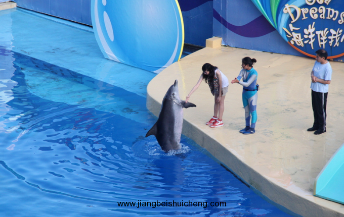 重頭戲——海洋劇場(chǎng)3:30開幕。前來(lái)觀看的游客一般會(huì)非常多,盡量提前半小時(shí)去,能坐陽(yáng)光爆曬的座位。節(jié)目?jī)?nèi)容很多,兩只海獅招手、倒立、揮手、拿救生圈救人、對(duì)“落水者”進(jìn)行人工呼吸……不知道與海獅kiss是啥味道。五只海豚則表演游泳比賽、跳高觸球、跨藍(lán)、空中翻身36周半、直立旋轉(zhuǎn)、仰泳等,真的是很有靈性。最讓我驚嘆的是那些團(tuán)體動(dòng)作,竟也能做得那樣整齊劃一,有板有眼。