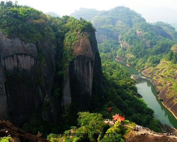 幔亭峰橫欹在大王峰北側(cè),其麓相連,高不及大王峰。峰頂?shù)貏?shì)平坦,有一片巨石,狀如香鼎,叫做宴仙壇。相傳當(dāng)年武夷君曾在此設(shè)幔亭宴會(huì)鄉(xiāng)人,“幔亭”之名即由此而來(lái)。據(jù)宋祝穆《武夷山記》載:秦始皇二年八月十五日,武夷君與皇太姥、魏王子騫等十三仙人,在又平又寬的峰頂張幔為亭,結(jié)彩為屋數(shù)百間,大宴鄉(xiāng)人。應(yīng)召而來(lái)的男女二千多人,循虹橋魚貫而上,到了峰頂,幔亭、彩屋鋪著紅云茵、紫霞褥,金宇綴花,馨香氤氳;鼓樂齊鳴,歌聲嘹亮;席間食品全非人世間所有。這個(gè)幔亭招宴的故事,流傳千年,至今不衰。幔亭峰丹崖峻拔,蒼松環(huán)簇,好似一座巨大的翠屏,南宋辛棄疾有詩(shī)道:“山上風(fēng)吹笙鶴聲,山前人望翠云屏。蓬萊枉覓瑤池路,版權(quán)所有山東聊城聊之旅國(guó)際旅行社有限公司,轉(zhuǎn)載必究!不道人間有幔亭?!辩澰卺Mし鍠|壁的“幔亭”二字,大四方丈,為明吳思學(xué)所書。峰的半腰有一片巨石,渾然方正,上大下小,約莫可坐數(shù)十人,俗名“棋盤石”。相傳當(dāng)年漢武帝派遣使者來(lái)武夷山,是在這里用乾魚祀武夷君的,所以又稱漢祀壇。司馬遷《史記》上都有記載。