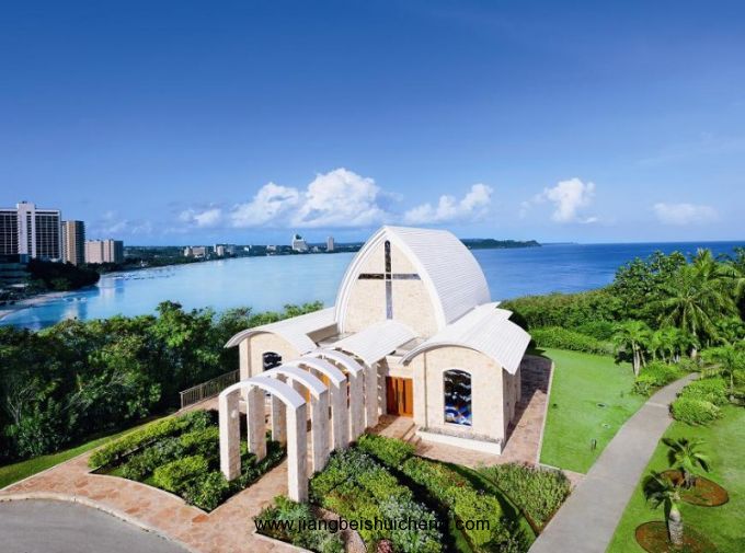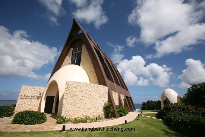 有近2000粒大小不同的施華洛世奇水晶從天花板垂下來,在陽光長年普照的關(guān)島,加上海水的折射,令教堂內(nèi)不斷閃耀著不同的顏色。全白色的墻加上藍(lán)白色的玻璃窗,整個教堂就像一座水晶宮。