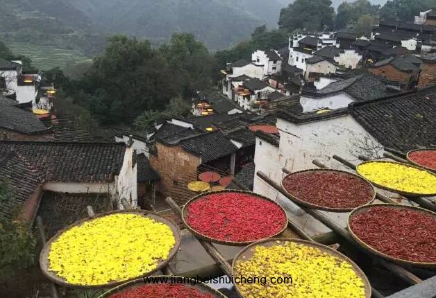 篁嶺古村數(shù)百棟徽派古民居在百米落差的坡面錯落有序,整個山間村落飽經(jīng)滄桑的徽式民居土磚外墻與曬架上、圓圓曬匾里五彩繽紛豐收果實組合,繪就出世界獨一無二的“曬秋”農(nóng)俗景觀、最美的鄉(xiāng)村符號。