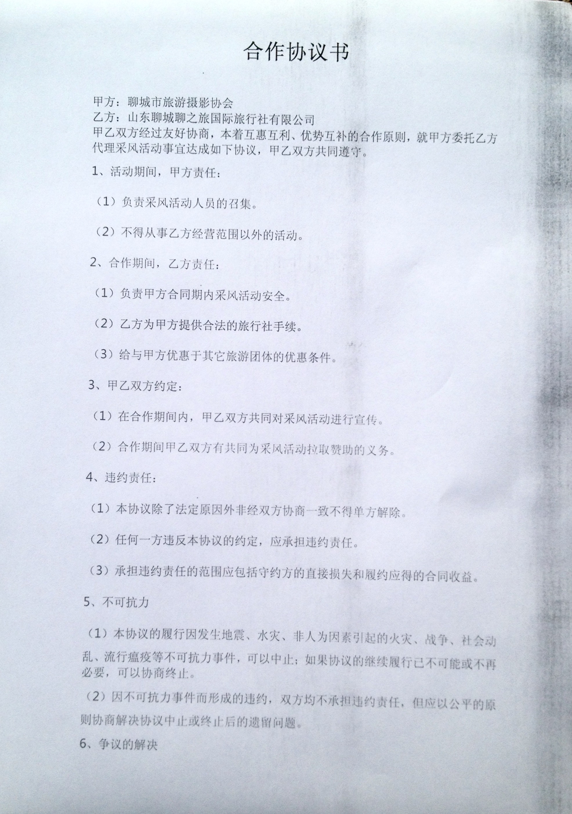 為響應(yīng)國(guó)家政策號(hào)召,聊城市旅游攝影協(xié)會(huì)委托我公司代理采風(fēng)活動(dòng)事宜,雙方經(jīng)過友好協(xié)商,本著互惠互利、優(yōu)勢(shì)互補(bǔ)的合作原則,達(dá)成以下協(xié)議。