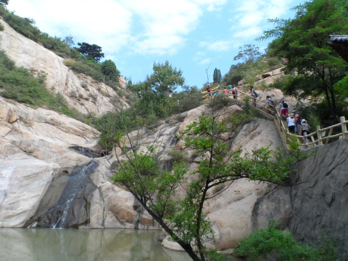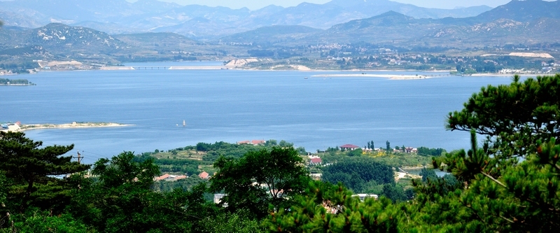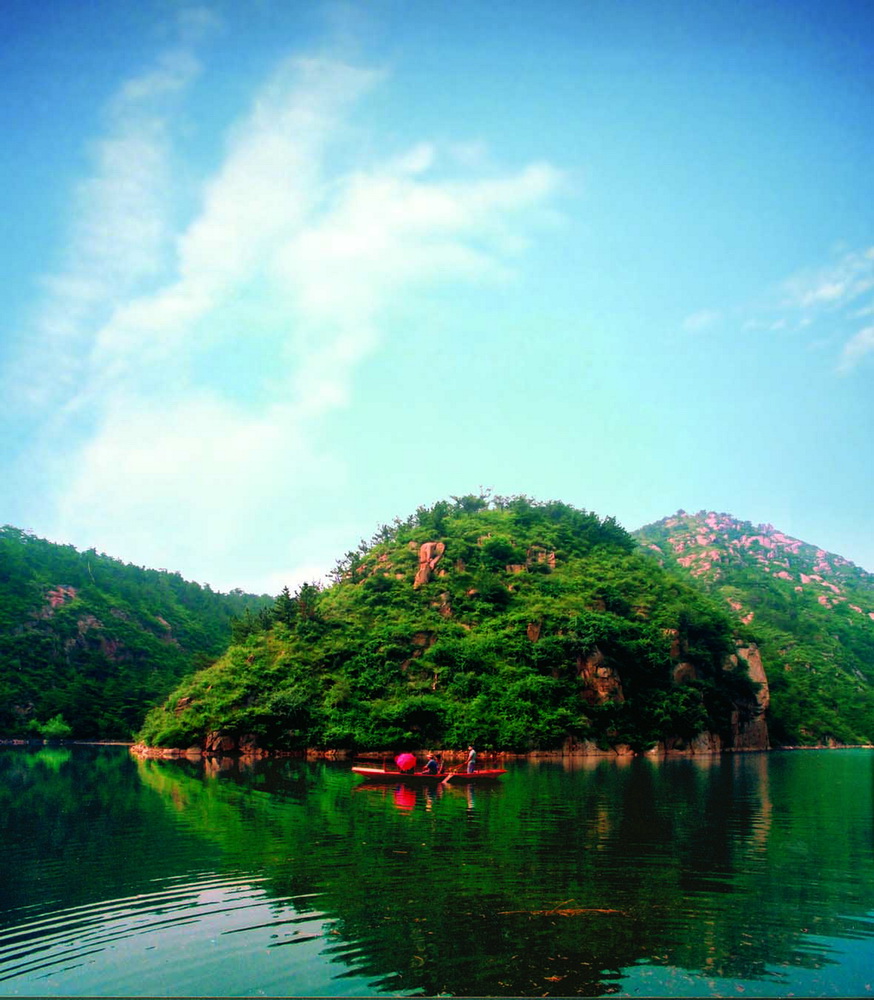 “高峽出平湖”,天綠湖有山東第一高湖之稱。天上人間、水天一色,蔚為壯觀、妙不可言,兩邊青山峻嶺,一座連一座,臨湖的一面就如刀削般,更為險(xiǎn)峻。