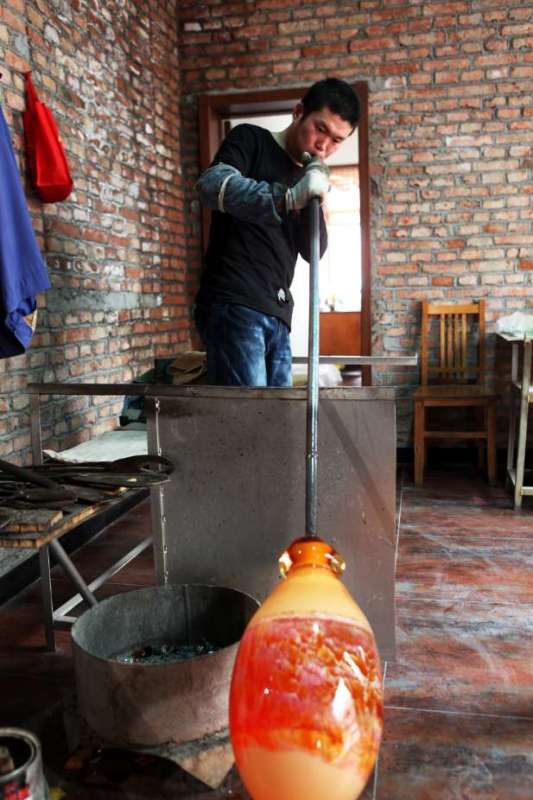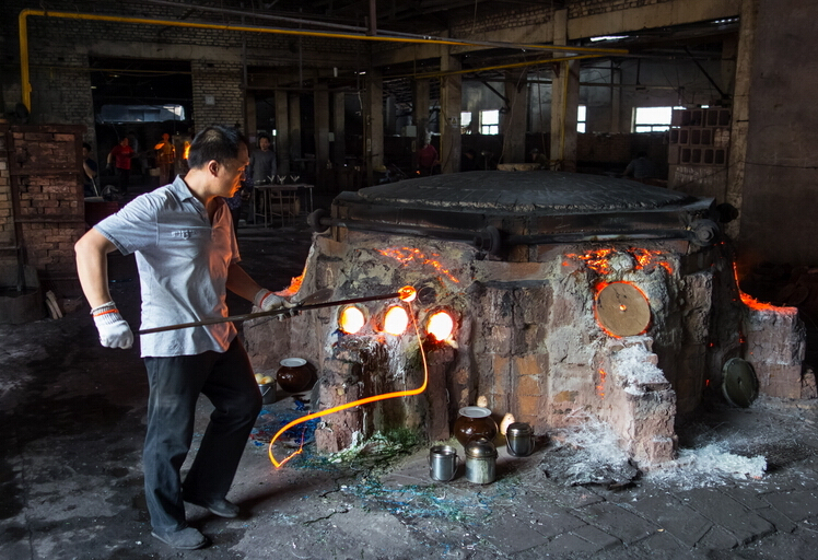 全程拍攝大爐琉璃制作,博山是琉璃之鄉(xiāng),保留傳承了琉璃加工的傳統(tǒng)技藝,并在此基礎(chǔ)上又自己的開(kāi)拓創(chuàng)新。琉璃的制作工藝相當(dāng)復(fù)雜,火里來(lái)、水里去,要幾十道工序才能完成,古法琉璃的精品制作,相當(dāng)費(fèi)時(shí),有的光制作過(guò)程就要十幾二十天,而且主要依靠手工制作。八卦爐,爐里的溫度在1400-1600度,工作車(chē)間內(nèi)的溫度能達(dá)到50攝氏度左右。還有傳說(shuō)琉璃是一個(gè)叫路申的博山人在用八卦爐煉丹的時(shí)候偶然發(fā)現(xiàn)的,觀其在經(jīng)過(guò)烈火煅燒之后還可以晶瑩剔透,遂以長(zhǎng)生不老之丹為名進(jìn)獻(xiàn)給當(dāng)時(shí)的國(guó)君,并置于朝堂以消滅災(zāi)禍。所以佩戴琉璃小飾品還有去災(zāi)避禍的用處。大師提取原料吹制的過(guò)程,都是大師們用空心的管根據(jù)顏色的需要從爐口中提取,然后用空心管吹制。在吹制的過(guò)程中,溫度就會(huì)下降,然后再上回溫爐進(jìn)行加工。
