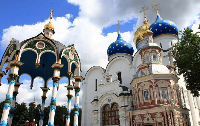 早餐后乘車前往宗教圣地-謝爾蓋耶夫鎮(zhèn),謝爾蓋耶夫鎮(zhèn)又名為扎戈?duì)査箍?。莫斯科的衛(wèi)星城市之一,位于市區(qū)東北71千米處。是一座風(fēng)景如畫,建筑獨(dú)特的城市,也是俄羅斯金環(huán)城市之一。抵達(dá)后參觀謝爾蓋三圣大修道院是俄羅斯著名最古老的大修道院之一 ,亦譯特羅伊察修道院。1337年一個(gè)名叫謝爾蓋·拉多涅日斯基的僧侶在莫斯科近郊謝爾蓋耶夫(即今扎戈?duì)査箍耍┑钠掷锝⒁蛔バ〗烫煤托〉婪?,為該修道院的前身。后來凡愿在此出家的人,必須自造小道房并自辟膳食用地,由此發(fā)展而成為東北羅斯最富有的大修道院。1744年獲大修道院稱號(hào),是東北羅斯古典建筑群的代表。修道院石墻高達(dá)15米,成為莫斯科北方重要防御據(jù)點(diǎn)。它擁有幾個(gè)世紀(jì)以來、歷經(jīng)各個(gè)朝代改建和擴(kuò)建的各種形式的教堂和附屬建筑群。包括三圣教堂、杜霍夫斯基降靈教堂、圣母升天教堂,教皇宮殿和斯摩棱斯克教堂(1748年),以及齋房、鐘樓、慈善醫(yī)院等。其中最著名的三圣教堂建于1423-1442年,是俄羅斯早期白石建筑藝術(shù)典范。在這里可以看到以畫《三位一體》而出名的俄羅斯畫家安德烈·魯布廖夫的壁畫作品等。
