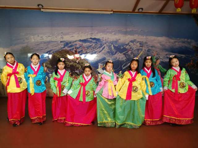 朝鮮族是一個(gè)能歌善舞的民族,象帽舞和腰鼓舞都是非常具有朝鮮風(fēng)韻的舞蹈。男孩學(xué)習(xí)象帽舞,女孩學(xué)習(xí)腰鼓舞,最后秀一場(chǎng)我們自導(dǎo)自演的匯報(bào)演出。