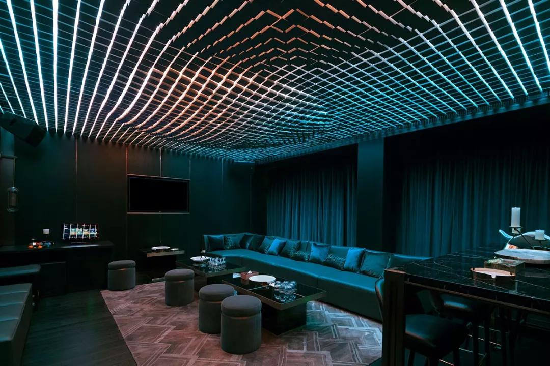 酒吧區(qū)域是一個(gè)動(dòng)態(tài)空間,室內(nèi)的現(xiàn)代化裝飾則與外界古色古香的建筑群形成強(qiáng)烈對(duì)比,數(shù)字化設(shè)計(jì)的黃銅立體網(wǎng)格結(jié)構(gòu)貫穿室內(nèi),將酒吧的各個(gè)空間串聯(lián)在一起。延伸的吧臺(tái)、舞動(dòng)的頂面、變換的星空頂燈制造出不同的視覺感受,引導(dǎo)人逐個(gè)探索每一個(gè)角落。酒吧區(qū)沒有采用尋常酒吧中常見的電視、投影設(shè)備以最大程度減少對(duì)人的擾動(dòng),營(yíng)造一個(gè)可以靜思、可以真正意義上產(chǎn)生思想碰撞的空間。KTV舞動(dòng)的頂面造型設(shè)計(jì)以數(shù)字矩陣為靈感,也是虛擬未來的象征。不同模式的燈光演繹讓音樂在這有了實(shí)體的呈現(xiàn)方式,音樂的流動(dòng)可以被視覺捕捉,活躍了整體空間的同時(shí)也增加了多感官交流。